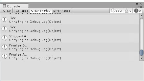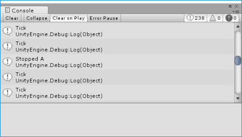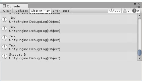}In this example, we start coroutine A when the game is started, and then it starts coroutine B. B immediately starts to print "Tick" to the console on each frame. And then we wait for 2 seconds and stop coroutine A by calling the StopCoroutine method by passing coroutine reference as argument. What do you think will happen when we stop coroutine A, do you think coroutine B will also stop?