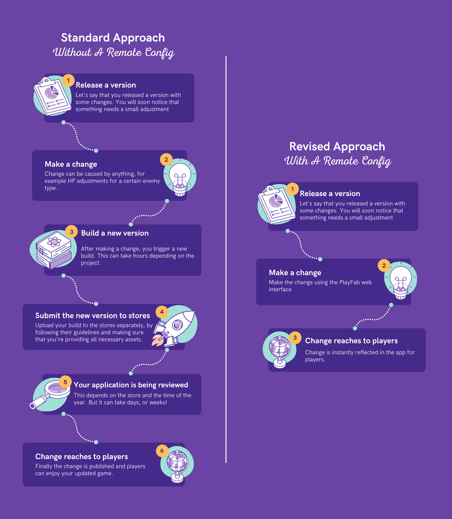 - Client side → Requires app update and store (Steam, GooglePlay, iTunes, etc.) review each time.